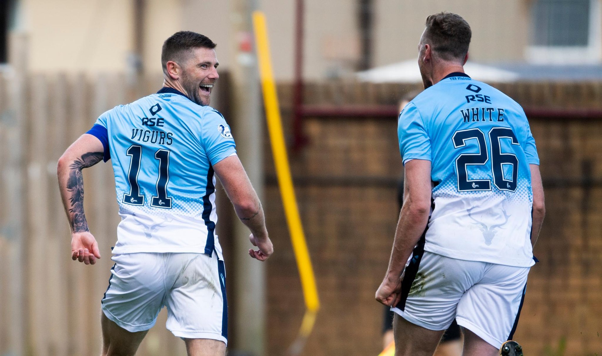 4 minutes after the restart, captain Iain Vigurs stepped up with a fabulous finish to equalise for the Staggies! Vigurs played a clever ‘one-two’ with Stephen Kelly on the edge of the area before opening his body and guiding a beautiful left-footed curling shot into the top left corner.